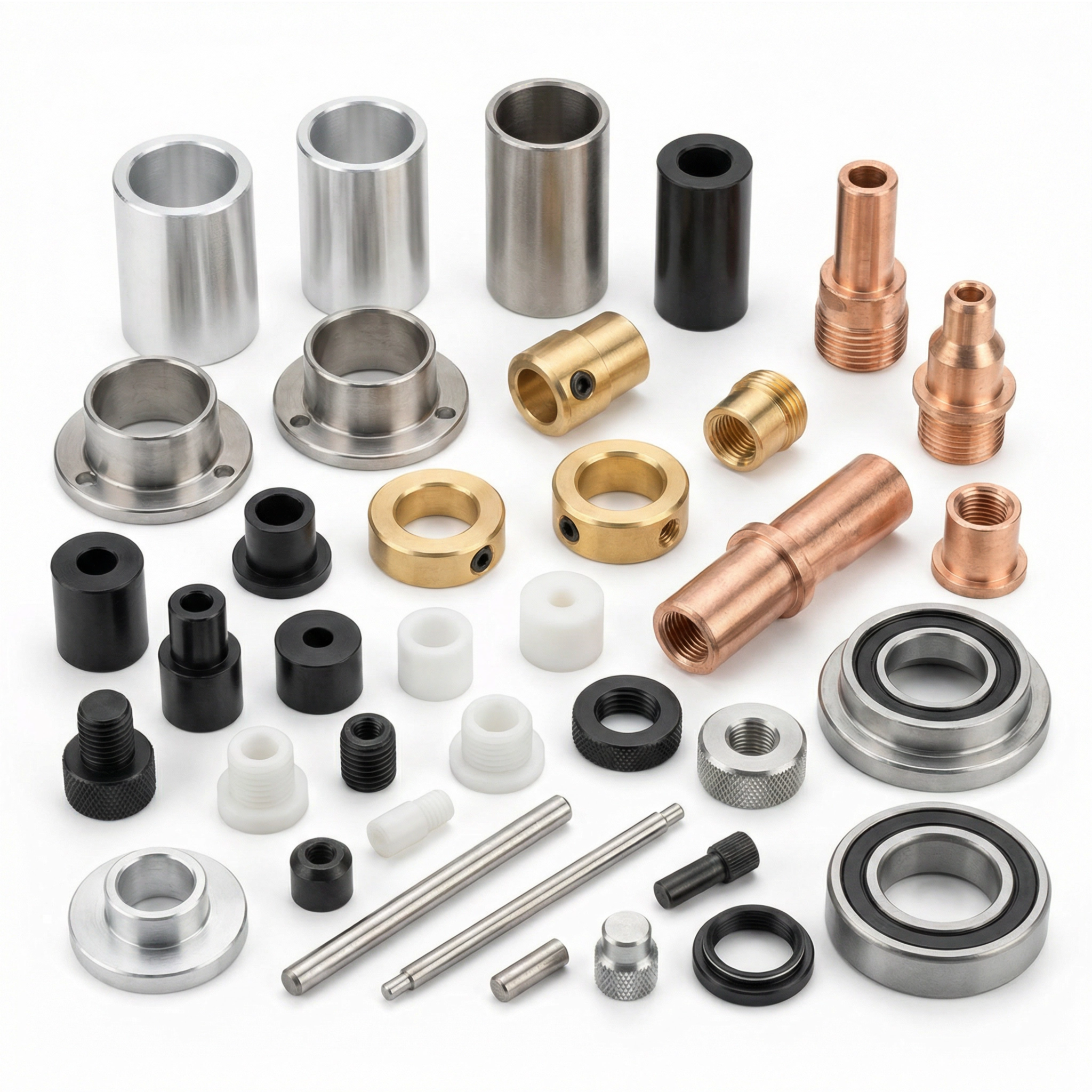 Typical Products: Shafts, pins, screws, bolts, nuts, bushings, sleeves, spacers, fittings, valve components, connectors.